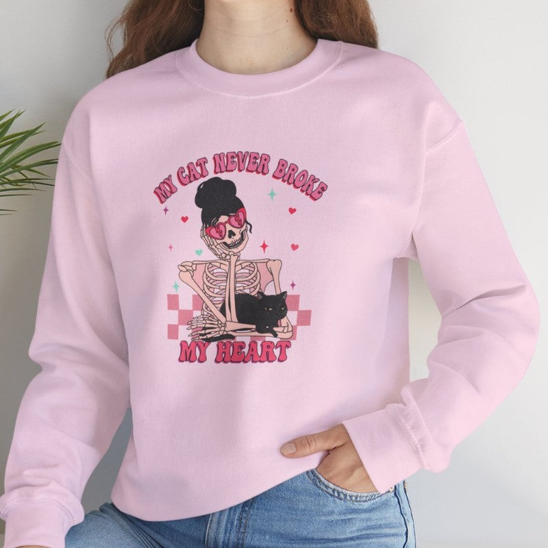 Snuggle up in style with our charming 'My Cat Never Broke My Heart' Crewneck. This delightful sweatshirt features a unique design portraying a loving skeleton cuddling her black cat, perfect for celebrating your furry feline companion this Valentine's Day.