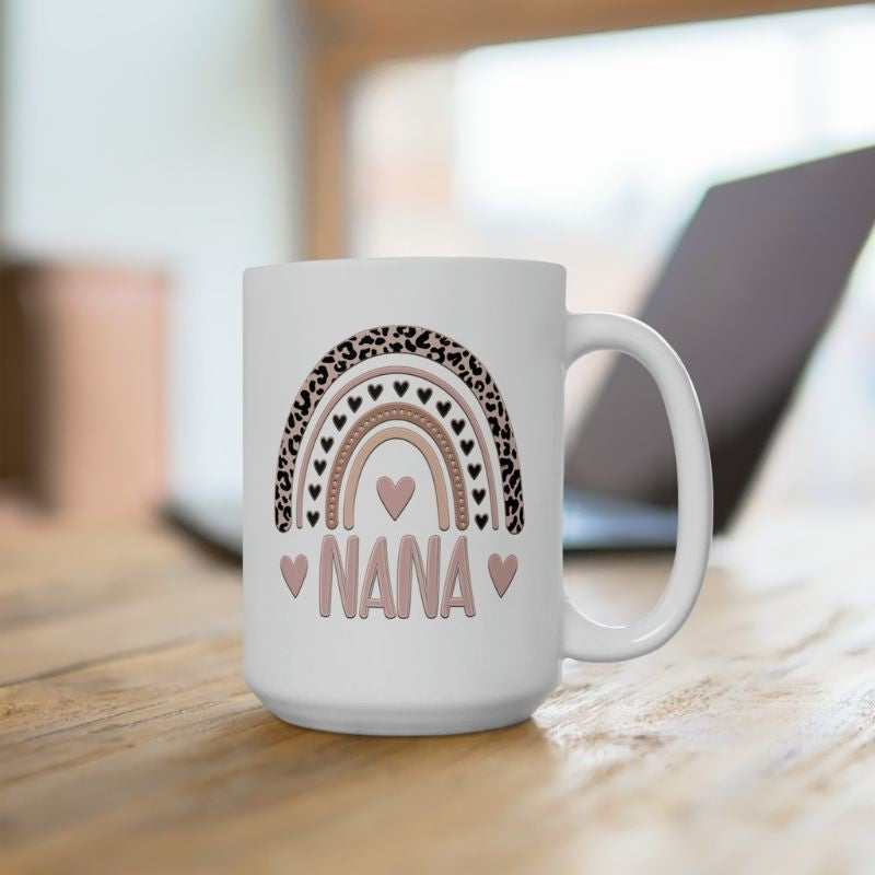 Don't miss the chance to bring a ray of sunshine to Nana's day. Purchase our 'Nana 15oz Coffee Mug with a boho style rainbow design' today and fill her mornings with love and color!
